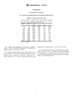 SIGNIFICANCE AND USE 4.1 Packaged products transported by meansn of the feeder aircraft network are liable to experience altitudes as high as 5 791 m [19 000 ft].4 When exposed to these high altitude conditions, products or packaging systems, or a combination thereof, may be affected negatively by the resultant pressure differential. 4.2 These test methods are suitable for evaluating the effect of high altitude on packaging systems. 4.3 These test methods are suitable for package or product, or both, development and engineering. 4.4 Other test methods, such as Test Methods D3078, D4991 and D5094, test for leakage of packaging systems by vacuum method and are applicable for testing the effects of high altitude. SCOPE 1.1 These test methods determine the effects of pressure differential when packaged products are transported by meansn of certain modes of transport, such as feeder aircraft or ground over high mountain passes. The results of these tests are intended to be used for qualitative purposes. 1.2 The values stated in either SI units or inch-pound units are to be regarded separately as standard. The values stated in each system may not be exact equivalents; therefore, each system shall be used independently of the other. Combining values from the two systems may result in non-conformance with the standard. 1.3 This standard does not purport to address all of the safety concerns, if any, associated with its use. It is the responsibility of the user of this standard to establish appropriate safety, health, and environmental practices and determine the applicability of regulatory limitations prior to use. 1.4 This international standard was developed in accordance with internationally recognized principles on standardization established in the Decision on Principles for the Development of International Standards, Guides and Recommendations issued by the World Trade Organization Technical Barriers to Trade (TBT) Committee.