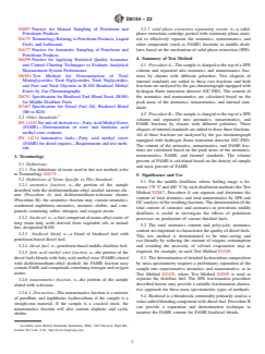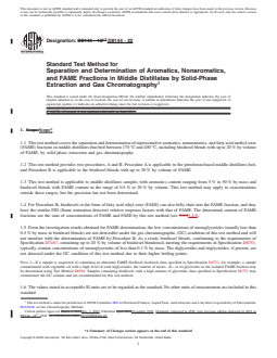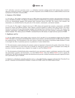 SIGNIFICANCE AND USE 5.1 For the middle distillates whose boiling range is between 170 °C and 400 °C by such distillation methods like Test Method D2887, Procedure A can separate and determine the content of total aromatics and total nonaromatics by SPE and GC analysis of the resulting fractions. The determination of the total content of saturates and aromatics in petroleum middle distillates is useful to investigate the effects of petroleum processes on production of various finished fuels. 5.2 The total aromatics content and polycyclic aromatics content are important to characterize the quality of diesel fuels. This test method is demonstrated to be time-saving and eco-friendly by reducing the amount of reagent consumption and avoiding the necessity of solvent evaporation step as required, for example, in such Test Method D2549. 5.3 The determination of detailed hydrocarbon composition by mass spectrometry requires a preliminary separation of the sample into representative aromatics and nonaromatics, as in Test Method D2425, where Test Method D2549 is used to separate the distillate fuel. The SPE fractionation procedure described herein may provide a suitable fractionation alternative approach for these mass spectrometric types of methods. 5.4 Biodiesel is a blendstock commodity primarily used as a value-added blending component with diesel fuel. Procedure B can provide a separation and determination technique to monitor the FAME content for FAME biodiesel blends. SCOPE 1.1 This test method covers the separation and determination of representative aromatics, nonaromatics, and fatty acid methyl ester (FAME) fractions in middle distillates that boil between 170 °C and 400 °C, including biodiesel blends with up to 20 % by volume of FAME, by solid phase extraction and gas chromatography. 1.2 This test method provides two procedures, A and B. Procedure A is applicable to the petroleum-based middle distillates fuel, and Procedure B is applicable to the biodiesel blends with up to 20 % by volume of FAME. 1.3 This test method is applicable to middle distillates samples with aromatics content ranging from 5 % to 50 % by mass and biodiesel blends with FAME content in the range of 0.5 % to 20 % by volume. This test method may apply to concentrations outside these ranges, but the precision has not been determined. 1.4 For Procedure B, biodiesels in the form of fatty acid ethyl ester (FAEE) can also fully elute into the FAME fraction, and they have the similar FID (flame ionization detector) relative response factors with that of FAME. The determined content of FAME fractions are the sum of concentrations of FAME and FAEE by this test method (see 3.2.5). 1.5 From the investigation results obtained for FAME determination, the low concentrations of monoglycerides (usually less than 0.5 % by mass in biodiesel blends) are not detectable under the gas chromatographic (GC) condition of this test method and will not interfere with the determination of FAME by Procedure B. As a result, biodiesel blends, conforming to the requirements of Specification D7467, containing up to 20 % by volume of biodiesel blendstock meeting the requirements in Specification D6751, typically contain concentrations of monoglycerides of less than 0.1 % by mass. The diglycerides and triglycerides, if present, are not detected under the GC condition of this test method due to their higher boiling points. Note 1: If a sample is suspected of containing an abnormal FAME biodiesel feedstock than specified in Specification D6751, for example, a sample contaminated with vegetable oil with a high level of total triglycerides, the content of mono-, di-, or tri-glycerides in the isolated FAME fraction may be determined using Test Method D6584. Samples containing biodiesels with a high amount of glycerides than specified in Specification D6751 may contaminate the GC column and not recommended for this test method. 1.6 The values stated in a...