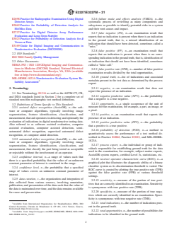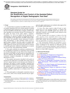 SIGNIFICANCE AND USE 5.1 This guide describes the recommended procedure for using software to assist with the identification of indications in digital radiographic images. Some of the concepts presented may be appropriate for other nondestructive test methods. 5.2 When properly applied, the methods and techniques outlined in this guide offer radiographic testing practitioners the potential to improve inspection reliability, reduce inspection cycle time, and harness inspection statistics for improving manufacturing processes. 5.3 The typical goal of a nondestructive test is to identify flaws that exceed the acceptance criteria. Due to the variability and uncertainty present in any inspection process, acceptance thresholds are established so that some acceptable components are discarded in an effort to prevent parts with discontinuities that exceed the acceptance criteria from entering service. This type of error, called a false positive, is considered less critical than a false negative error which would allow a nonconforming part into service. A successful application of AssistDR minimizes the false positive rate while reducing the false negative rate to levels appropriate for the intended application. The methods and techniques described in this guide facilitate achieving this desired outcome. 5.4 With the advent of deep learning, convolutional neural networks, and other forms of artificial intelligence, scenarios become possible where an AssistDR system continues to evolve or learn after qualification for production use. This guide does not address learning-based AssistDR systems. This guide addresses only deterministic systems that have software code and parameters that are fixed after qualification. Note that this limitation does not prohibit the use of this guide for developing a qualification and usage strategy for software using deep learning technology. The training or learning process for the deep learning system would need to be completed before qualification and all ... SCOPE 1.1 Assisted defect recognition (AssistDR) describes a class of computer algorithms that assist a human operator in making a determination about nondestructive test data. This guide uses the term AssistDR to describe those computer assisted evaluation algorithms and associated software. For the purposes of this guide, the usage of the words “defect,” “evaluate,” “evaluation,” etc., in no way implies that the algorithms are dispositioning or otherwise making an unaided final disposition. Depending on the application, AssistDR computer algorithms detect and optionally classify indications of defects, flaws, discontinuities, or other anomalous signals in the acquired images. Software that does make an unaided final disposition is classified as automated defect recognition (AutoDR). While the concepts discussed in this guide are pertinent to AutoDR applications, additional validation tests or controls may be necessary when implementing AutoDR. 1.2 This guide establishes the minimum considerations for the radiographical examination of components using AssistDR for non-film radiographic test data. Most of the examples and discussion in this guide are built around two-dimensional test data for simplicity. The principles can be applied to three (volumetric computed tomography, for example) or higher dimensional test data. 1.3 The methods and practices described in this guide are intended for the application of AssistDR where image analysis will aid a human operator in the detection and evaluation of indications. The degree to which AssistDR is integrated into the testing and evaluation process will help the user determine the appropriate levels of process qualification and control required. This guide is not intended for applications wishing to employ AutoDR in which there is no human review of the results. 1.4 This guide applies to radiographic examination using an X-ray source. Some of the concepts presented may be ap...