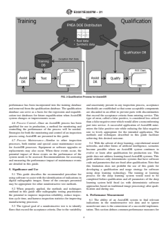 ASTM E3327/E3327M-21 is a guide published by ASTM International. Its full title is "Standard Guide for the Qualification and Control of the Assisted Defect Recognition of Digital Radiographic Test Data". This standard covers: SIGNIFICANCE AND USE 5.1 This guide describes the recommended procedure for using software to assist with the identification of indications in digital radiographic images. Some of the concepts presented may be appropriate for other nondestructive test methods. 5.2 When properly applied, the methods and techniques outlined in this guide offer radiographic testing practitioners the potential to improve inspection reliability, reduce inspection cycle time, and harness inspection statistics for improving manufacturing processes. 5.3 The typical goal of a nondestructive test is to identify flaws that exceed the acceptance criteria. Due to the variability and uncertainty present in any inspection process, acceptance thresholds are established so that some acceptable components are discarded in an effort to prevent parts with discontinuities that exceed the acceptance criteria from entering service. This type of error, called a false positive, is considered less critical than a false negative error which would allow a nonconforming part into service. A successful application of AssistDR minimizes the false positive rate while reducing the false negative rate to levels appropriate for the intended application. The methods and techniques described in this guide facilitate achieving this desired outcome. 5.4 With the advent of deep learning, convolutional neural networks, and other forms of artificial intelligence, scenarios become possible where an AssistDR system continues to evolve or learn after qualification for production use. This guide does not address learning-based AssistDR systems. This guide addresses only deterministic systems that have software code and parameters that are fixed after qualification. Note that this limitation does not prohibit the use of this guide for developing a qualification and usage strategy for software using deep learning technology. The training or learning process for the deep learning system would need to be completed before qualification and all ... SCOPE 1.1 Assisted defect recognition (AssistDR) describes a class of computer algorithms that assist a human operator in making a determination about nondestructive test data. This guide uses the term AssistDR to describe those computer assisted evaluation algorithms and associated software. For the purposes of this guide, the usage of the words “defect,” “evaluate,” “evaluation,” etc., in no way implies that the algorithms are dispositioning or otherwise making an unaided final disposition. Depending on the application, AssistDR computer algorithms detect and optionally classify indications of defects, flaws, discontinuities, or other anomalous signals in the acquired images. Software that does make an unaided final disposition is classified as automated defect recognition (AutoDR). While the concepts discussed in this guide are pertinent to AutoDR applications, additional validation tests or controls may be necessary when implementing AutoDR. 1.2 This guide establishes the minimum considerations for the radiographical examination of components using AssistDR for non-film radiographic test data. Most of the examples and discussion in this guide are built around two-dimensional test data for simplicity. The principles can be applied to three (volumetric computed tomography, for example) or higher dimensional test data. 1.3 The methods and practices described in this guide are intended for the application of AssistDR where image analysis will aid a human operator in the detection and evaluation of indications. The degree to which AssistDR is integrated into the testing and evaluation process will help the user determine the appropriate levels of process qualification and control required. This guide is not intended for applications wishing to employ AutoDR in which there is no human review of the results. 1.4 This guide applies to radiographic examination using an X-ray source. Some of the concepts presented may be ap...