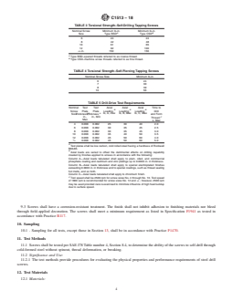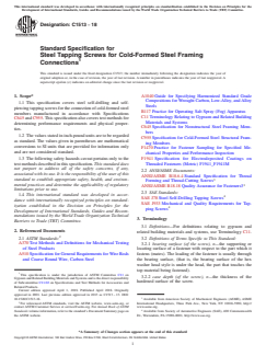ASTM C1513-18 is a technical specification published by ASTM International. Its full title is "Standard Specification for Steel Tapping Screws for Cold-Formed Steel Framing Connections". This standard covers: ABSTRACT This specification covers steel self-drilling and self-piercing tapping screws for the connection of cold-formed steel members manufactured. This specification also covers test methods for determining performance requirements such as dimension, and total case depth; and physical properties such as hardness, ductility, torsional strength, drill drive performance, and self-drilling tapping screw drill capacity. SCOPE 1.1 This specification covers steel self-drilling and self-piercing tapping screws for the connection of cold-formed steel members manufactured in accordance with Specifications C645 and C955. This specification also covers test methods for determining performance requirements and physical properties. 1.2 The values stated in inch-pound units are to be regarded as standard. The values given in parentheses are mathematical conversions to SI units that are provided for information only and are not considered standard. 1.3 The following safety hazards caveat pertains only to the test methods described in this specification. This standard does not purport to address all of the safety concerns, if any, associated with its use. It is the responsibility of the user of this standard to establish appropriate safety, health, and environmental practices and determine the applicability of regulatory limitations prior to use. 1.4 This international standard was developed in accordance with internationally recognized principles on standardization established in the Decision on Principles for the Development of International Standards, Guides and Recommendations issued by the World Trade Organization Technical Barriers to Trade (TBT) Committee.