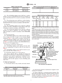 ABSTRACT This specification covers steel self-drilling and self-piercing tapping screws for the connection of cold-formed steel members manufactured. This specification also covers test methods for determining performance requirements such as dimension, and total case depth; and physical properties such as hardness, ductility, torsional strength, drill drive performance, and self-drilling tapping screw drill capacity. SCOPE 1.1 This specification covers steel self-drilling and self-piercing tapping screws for the connection of cold-formed steel members manufactured in accordance with Specifications C645 and C955. This specification also covers test methods for determining performance requirements and physical properties. 1.2 The values stated in inch-pound units are to be regarded as standard. The values given in parentheses are mathematical conversions to SI units that are provided for information only and are not considered standard. 1.3 The following safety hazards caveat pertains only to the test methods described in this specification. This standard does not purport to address all of the safety concerns, if any, associated with its use. It is the responsibility of the user of this standard to establish appropriate safety, health, and environmental practices and determine the applicability of regulatory limitations prior to use. 1.4 This international standard was developed in accordance with internationally recognized principles on standardization established in the Decision on Principles for the Development of International Standards, Guides and Recommendations issued by the World Trade Organization Technical Barriers to Trade (TBT) Committee.