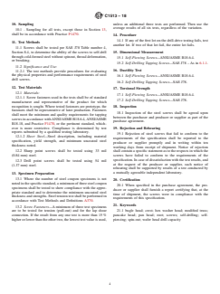 This specification covers steel self-drilling and self-piercing tapping screws for the connection of cold-formed steel members manufactured. This specification also covers test methods for determining performance requirements such as dimension, and total case depth; and physical properties such as hardness, ductility, torsional strength, drill drive performance, and self-drilling tapping screw drill capacity.