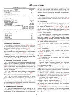 ASTM C1410-17(2023) is a technical specification published by ASTM International. Its full title is "Standard Specification for Cellular Melamine Thermal and Sound-Absorbing Insulation". This standard covers: ABSTRACT This specification covers cellular melamine thermal and sound-absorbing insulation for use in industrial environments operating within the specified temperature range. Some applications of the thermal insulation materials covered by this standard are subject to building codes for fire performance. A vapor retarder is required when the insulation materials are used for cold surface applications where water vapor condense and may cause a decrease in thermal performance. Open-cell melamine foam is produced when a pentane blowing agent is used to foam a melamine-aldehyde precondensate. Melamine thermal insulation is furnished in three types according to shape and two grades according to facing. The typical facing materials are aluminum foil, aluminized mylar, polyvinylchloride, and polyvinylfluoride. All materials should conform to the required values of oxygen index, specific optical smoke density, surface burning characteristics, density, tensile strength, percent elongation, indentation force deflection, and thermal conductivity. SCOPE 1.1 This specification covers the type, physical properties, and dimensions of open-cell melamine foam intended for use as thermal and sound-absorbing insulation for temperatures from −40 to +350°F (−40 to +177°C) in industrial environments. 1.2 Some uses of thermal insulation materials covered by this specification are governed by building codes that address fire performance. 1.3 The use of an appropriate vapor retarder is required on cold surface applications where water vapor condense and cause a decrease in thermal performance. Refer to Practice C755 for selection of vapor retarders. Facings shall be agreed upon between the purchaser and the manufacturer or supplier. 1.4 The values stated in inch-pound units are to be regarded as standard. The values given in parentheses are mathematical conversions to SI units that are provided for information only and are not considered standard. 1.5 This standard does not purport to address all of the safety concerns, if any, associated with its use. It is the responsibility of the user of this standard to establish appropriate safety, health, and environmental practices and determine the applicability of regulatory limitations prior to use. 1.6 This international standard was developed in accordance with internationally recognized principles on standardization established in the Decision on Principles for the Development of International Standards, Guides and Recommendations issued by the World Trade Organization Technical Barriers to Trade (TBT) Committee.