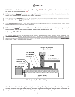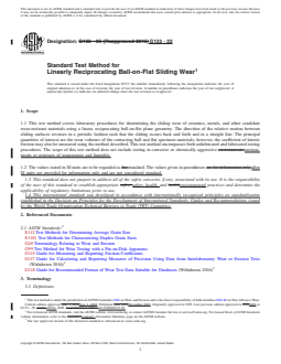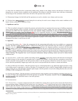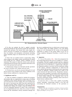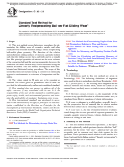 SIGNIFICANCE AND USE 5.1 This test method is designed to simulate the geometry and motions that are experienced in many types of rubbing components whose normal operation results in periodic reversals in the direction of relative sliding. The wear resulting from this mode of movement may differ from that experienced by the same materials sliding continuously in only one direction (unidirectional sliding, for example, using Test Method G99) even for comparable durations of contact. This is particularly true for liquid-lubricated tests where the reversal of motion means that the entrainment velocity transitions through zero but also in unlubricated tests in which stress reversal occurs. The normal load(s) and sliding speed(s) to be used during testing are to be determined by the severity of the proposed application or purpose of the testing. Either of two sets of testing conditions (designated Procedures A and B) may be used. SCOPE 1.1 This test method covers laboratory procedures for determining the sliding wear of ceramics, metals, and other candidate wear-resistant materials using a linear, reciprocating ball-on-flat plane geometry. The direction of the relative motion between sliding surfaces reverses in a periodic fashion such that the sliding occurs back and forth and in a straight line. The principal quantities of interest are the wear volumes of the contacting ball and flat specimen materials; however, the coefficient of kinetic friction may also be measured using the method described. This test method encompasses both unlubricated and lubricated testing procedures. The scope of this test method does not include testing in corrosive or chemically aggressive environments or extremes of temperature and humidity. 1.2 The values stated in SI units are to be regarded as standard. The values given in parentheses after SI units are provided for information only and are not considered standard. 1.3 This standard does not purport to address all of the safety concerns, if any, associated with its use. It is the responsibility of the user of this standard to establish appropriate safety, health, and environmental practices and determine the applicability of regulatory limitations prior to use. 1.4 This international standard was developed in accordance with internationally recognized principles on standardization established in the Decision on Principles for the Development of International Standards, Guides and Recommendations issued by the World Trade Organization Technical Barriers to Trade (TBT) Committee.