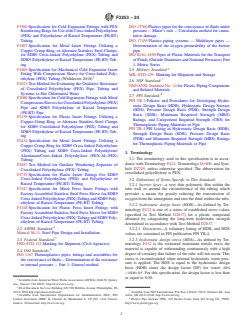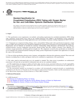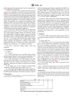 ABSTRACT This specification covers the requirements, test methods, and markings for crosslinked polyethylene (PEX) tubing with a polymeric oxygen barrier layer, made in one standard dimension ratio (SDR 9), and distribution system components intended for hydronic heating and cooling applications up to and including a maximum working temperature of 200°F (93°C). Components are comprised of tubing, fittings, valves, and manifolds that are intended for use in residential and commercial hydronic heating and cooling systems. Tubing made to this specification incorporates a single outer or middle wall oxygen barrier layer designed to inhibit the transmission or permeation of oxygen through the tubing wall. The requirements and test methods cover materials, workmanship, tubing dimensions and tolerances, burst pressure, sustained pressure, excessive temperature and pressure, thermo-cycling, bent tube, oxidative resistance, layer adhesion, UV resistance, oxygen permeation, and fitting pullout strength tests. SCOPE 1.1 This specification covers requirements, test methods, and marking requirements for crosslinked polyethylene (PEX) tubing with a polymeric oxygen barrier layer, made in one standard dimension ratio (SDR 9), and distribution system components intended for hydronic heating and cooling applications up to and including a maximum working temperature of 200 °F (93 °C). 1.1.1 Components are comprised of tubing, fittings, valves, and manifolds. Tubing made to this specification incorporates a single outer or middle wall oxygen barrier layer intended for inhibiting the transmission or permeation of oxygen through the tubing wall. Requirements and test methods are included for materials, workmanship, tubing dimensions and tolerances, burst pressure, sustained pressure, excessive temperature and pressure, thermo-cycling, bent tube, oxidative resistance, layer adhesion, UV resistance, oxygen permeation, and fitting pull-out strength tests. The components covered by this specification are intended for use in residential and commercial hydronic heating and cooling systems. Requirements for potable water applications are outside the scope of this specification. 1.2 The text of this specification references notes, footnotes, and appendixes which provide explanatory material. These notes and footnotes (excluding those in tables and figures) shall not be considered as requirements of the specification. 1.3 The values stated in inch-pound units are to be regarded as standard. The values given in parentheses are mathematical conversions to SI units that are provided for information only and are not considered standard. 1.4 This standard does not purport to address all of the safety concerns, if any, associated with its use. It is the responsibility of the user of this standard to establish appropriate safety, health, and environmental practices and determine the applicability of regulatory limitations prior to use. 1.5 This international standard was developed in accordance with internationally recognized principles on standardization established in the Decision on Principles for the Development of International Standards, Guides and Recommendations issued by the World Trade Organization Technical Barriers to Trade (TBT) Committee.