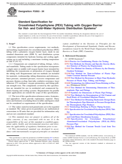 ASTM F3253-24 is a technical specification published by ASTM International. Its full title is "Standard Specification for Crosslinked Polyethylene (PEX) Tubing with Oxygen Barrier for Hot- and Cold-Water Hydronic Distribution Systems". This standard covers: ABSTRACT This specification covers the requirements, test methods, and markings for crosslinked polyethylene (PEX) tubing with a polymeric oxygen barrier layer, made in one standard dimension ratio (SDR 9), and distribution system components intended for hydronic heating and cooling applications up to and including a maximum working temperature of 200°F (93°C). Components are comprised of tubing, fittings, valves, and manifolds that are intended for use in residential and commercial hydronic heating and cooling systems. Tubing made to this specification incorporates a single outer or middle wall oxygen barrier layer designed to inhibit the transmission or permeation of oxygen through the tubing wall. The requirements and test methods cover materials, workmanship, tubing dimensions and tolerances, burst pressure, sustained pressure, excessive temperature and pressure, thermo-cycling, bent tube, oxidative resistance, layer adhesion, UV resistance, oxygen permeation, and fitting pullout strength tests. SCOPE 1.1 This specification covers requirements, test methods, and marking requirements for crosslinked polyethylene (PEX) tubing with a polymeric oxygen barrier layer, made in one standard dimension ratio (SDR 9), and distribution system components intended for hydronic heating and cooling applications up to and including a maximum working temperature of 200 °F (93 °C). 1.1.1 Components are comprised of tubing, fittings, valves, and manifolds. Tubing made to this specification incorporates a single outer or middle wall oxygen barrier layer intended for inhibiting the transmission or permeation of oxygen through the tubing wall. Requirements and test methods are included for materials, workmanship, tubing dimensions and tolerances, burst pressure, sustained pressure, excessive temperature and pressure, thermo-cycling, bent tube, oxidative resistance, layer adhesion, UV resistance, oxygen permeation, and fitting pull-out strength tests. The components covered by this specification are intended for use in residential and commercial hydronic heating and cooling systems. Requirements for potable water applications are outside the scope of this specification. 1.2 The text of this specification references notes, footnotes, and appendixes which provide explanatory material. These notes and footnotes (excluding those in tables and figures) shall not be considered as requirements of the specification. 1.3 The values stated in inch-pound units are to be regarded as standard. The values given in parentheses are mathematical conversions to SI units that are provided for information only and are not considered standard. 1.4 This standard does not purport to address all of the safety concerns, if any, associated with its use. It is the responsibility of the user of this standard to establish appropriate safety, health, and environmental practices and determine the applicability of regulatory limitations prior to use. 1.5 This international standard was developed in accordance with internationally recognized principles on standardization established in the Decision on Principles for the Development of International Standards, Guides and Recommendations issued by the World Trade Organization Technical Barriers to Trade (TBT) Committee.