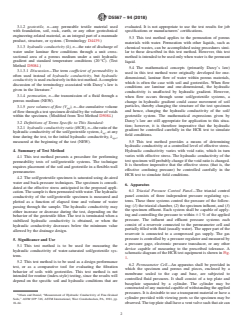 5.5 This test method provides a means of determining hydraulic conductivity at a controlled level of effective stress. Hydraulic conductivity varies with void ratio, which in turn varies with effective stress. The hydraulic conductivity of the test specimen will probably change if the vo...