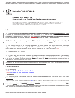SIGNIFICANCE AND USE 4.1 This test method, when applied to available products and proposed prototypes, is meant to provide a database of product functionality capabilities (in light of the suggested test regimens) that is hoped will aid the physician in making a more informed total knee replacement (TKR) selection. 4.2 A proper matching of TKR functional restorative capabilities and the recipient's (patient’s) needs is more likely to be provided by a rational testing protocol of the implant in an effort to reveal certain device characteristics pertinent to the selection process. 4.3 The TKR product designs are varied and offer a wide range of constraint (stability). The constraint of the TKR in the in vitro condition depends on several geometrical and kinematic interactions among the implant's components which can be identified and quantified. The degree of TKR's kinematic interactions should correspond to the recipient's needs as determined by the physician during clinical examination. 4.4 For mobile bearing knee systems, the constraint of the entire implant construct shall be characterized. Constraint of mobile bearings is dictated by design features at both the inferior and superior articulating interfaces. 4.5 The methodology, utility, and limitations of constraint/laxity testing are discussed.3, 4 The authors recognize that evaluating isolated implants (that is, without soft tissues) does not directly predict in vivo behavior, but will allow comparisons among designs. Constraint testing is also useful for characterizing implant performance at extreme ranges of motion which may be encountered in vivo at varying frequencies, depending on the patient’s anatomy, pre-operative capability, and post-operative activities and lifestyle. SCOPE 1.1 This test method may be used to compare the constraint characteristics of total knee replacements (TKRs) with the intent of comparing new designs to existing clinically successful designs or to determine the constraint differences between two similar or dissimilar designs. 1.2 This test method covers the means by which a TKR constraint may be quantified according to motion delineated by the inherent articular design as determined under specific loading conditions in an in-vitro environment. 1.3 Tests deemed applicable to the constraint determination are antero-posterior draw, medio-lateral shear, rotary laxity, valgus-varus rotation, and distraction, as applicable. Also covered is the identification of geometrical parameters of the contacting surfaces which would influence this motion and the means of reporting the test results. (See Practices E4.) 1.4 This test method is not a wear test. 1.5 The values stated in SI units are to be regarded as standard. No other units of measurement are included in this standard. 1.6 This standard does not purport to address all of the safety concerns, if any, associated with its use. It is the responsibility of the user of this standard to establish appropriate safety, health, and environmental practices and determine the applicability of regulatory limitations prior to use. 1.7 This international standard was developed in accordance with internationally recognized principles on standardization established in the Decision on Principles for the Development of International Standards, Guides and Recommendations issued by the World Trade Organization Technical Barriers to Trade (TBT) Committee.