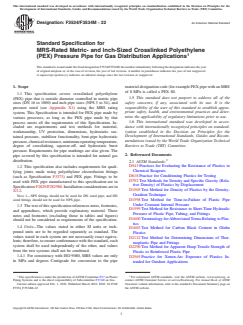 ASTM F3534/F3534M-22 is a technical specification published by ASTM International. Its full title is "Standard Specification for MRS-Rated Metric- and Inch-Sized Crosslinked Polyethylene (PEX) Pressure Pipe for Gas Distribution Applications". This standard covers: SCOPE 1.1 This specification covers crosslinked polyethylene (PEX) pipe that is outside diameter controlled in metric pipe sizes (DN 16 to 1000) and inch pipe sizes (NPS 3 to 54), and pressure rated (see Appendix X1) using the MRS rating system. This Specification is intended for PEX pipe made by various processes, as long as the PEX pipe made by that process meets all the requirements of this Specification. Included are requirements and test methods for material, workmanship, UV protection, dimensions, hydrostatic sustained pressure, stabilizer functionality, bent-pipe hydrostatic pressure, chemical resistance, minimum operating temperature, degree of crosslinking, squeeze-off, and hydrostatic burst pressure. Requirements for pipe markings are also given. The pipe covered by this specification is intended for natural gas distribution. 1.2 This specification also includes requirements for qualifying joints made using polyethylene electrofusion fittings (such as Specification F3373) and PEX pipe. Fittings to be used with PEX pipe manufactured to this specification are in Specification F2829/F2829M. Installation considerations are in X3.2. Note 1: NPS fittings should not be used for DN sized pipe, and DN sized fittings should not be used for NPS pipe. 1.3 The text of this specification references notes, footnotes, and appendixes, which provide explanatory material. These notes and footnotes (excluding those in tables and figures) should not be considered as requirements of the specification. 1.4 Units—The values stated in either SI units or inch-pound units are to be regarded separately as standard. The values stated in each system are not necessarily exact equivalents; therefore, to ensure conformance with the standard, each system shall be used independently of the other, and values from the two systems shall not be combined. 1.4.1 For consistency with ISO 9080, MRS values are only in MPa and degrees Centigrade for conversion to the pipe material designation code (for example PEX pipe with an MRS of 8 MPa is called a PEX 80. 1.5 This standard does not purport to address all of the safety concerns, if any, associated with its use. It is the responsibility of the user of this standard to establish appropriate safety, health, and environmental practices and determine the applicability of regulatory limitations prior to use. 1.6 This international standard was developed in accordance with internationally recognized principles on standardization established in the Decision on Principles for the Development of International Standards, Guides and Recommendations issued by the World Trade Organization Technical Barriers to Trade (TBT) Committee.