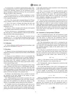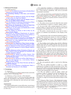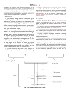 SIGNIFICANCE AND USE 5.1 The soil permittivity probe is used for the following purposes: 5.1.1 The test method described is useful as a rapid, nondestructive technique for bulk measurements of the water mass per unit volume of soil and soil-aggregate which may, in conjunction with an independent bulk density determination, be used in the determination of dry density. 5.1.2 The test method is used for quality control and acceptance testing of compacted soil and soil-aggregate mixtures as used in construction and also for research and development. The nondestructive nature allows repetitive measurements at a single test location and statistical analysis of the results. 5.1.3 Volumetric Water Content—The fundamental assumptions inherent in the test method are that the dielectric constants value measured by the system in a given test site composed of soil or soil-aggregate are directly correlated to the volumetric water content of the soil or soil-aggregate, and that the material is homogeneous. (See 6, “Interferences.”) Note 2: The quality of the result produced by this standard is dependent on the competence of the personnel performing it, and the suitability of the equipment and facilities used. Agencies that meet the criteria of Practice D3740 are generally considered capable of competent and objective testing/sampling/inspection/etc. Users of this standard are cautioned that compliance with Practice D3740 does not in itself assure reliable results. Reliable results depend on many factors; Practice D3740 provides a means of evaluating some of those factors. SCOPE 1.1 This test method describes the procedures for measuring the water mass per unit volume of soil and soil-aggregate by use of an in situ permittivity probe. Measurements are taken at a depth beneath the surface of the soil determined by the design of the probe. 1.1.1 For limitations see Section 6 on Interferences. 1.2 The permittivity probe is inserted into a hole drilled or punched into the soil being measured. As its name indicates, the probe measures the dielectric permittivity of the soil into which it is placed. Two electrodes, connected to an oscillating circuit, are mounted a predetermined distance apart. These electrodes act as the plates of a capacitor, with the soil between the plates forming the capacitor dielectric. 1.2.1 The probe circuit creates an oscillating electric field in the soil. Changes in the dielectric permittivity of the soil are indicated by changes in the circuit’s operating frequency. Since water has a much higher dielectric constant (80) than the surrounding soil (typically around 4), the water content can be related by a mathematical function to the change in dielectric permittivity, and, consequently, the changes in the circuit’s operating frequency. 1.2.2 The construction, deployment, and operating principle of the device described in this test method differ from other methods that measure the dielectric constant, bulk electrical conductivity, complex impedance, or electromagnetic impedance (see Test Methods D6780/D6780M, D7698, and D7830/D7830M) of the soil and relate the results to water mass per unit volume and/or water content. 1.2.3 The water content of the soil measured by the permittivity probe is the volumetric water content, expressed as the ratio of the volume of water to the total volume occupied by the soil. This quantity is often converted, and displayed, by the probe in units of mass of water per volume of soil, or water mass per unit volume. This conversion is performed by multiplying the water content (in volume of water per volume of soil) by the density of water. 1.3 Water content most prevalent in engineering and construction activities is known as the gravimetric water content, ω, and is the ratio of the mass of the water in pore spaces to the total mass of solids, expressed as a percentage. To determine this quantity, the bulk density of the soil under measurement must ...
