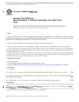 SIGNIFICANCE AND USE 5.1 This test method establishes a standard procedure for the test and provides data that can be related to the force required to unseat the bead of a tire inflated with a specified pressure from the rim. This test method does not establish performance limits or tolerances for tire specifications. SCOPE 1.1 This test method covers the static non-rolling laboratory method of determination of a tubeless tire’s resistance to bead unseating. The test requires the use of a standardized fixture and load machine. The test is conducted using a defined test pressure and method of determining the resultant force to unseat the tire from the rim. 1.2 This test method is applicable for all passenger, light truck, and temporary spare tires. 1.3 The values stated in SI units are to be regarded as standard. The values given in parentheses are for information only. 1.4 This standard does not purport to address all of the safety concerns, if any, associated with its use. It is the responsibility of the user of this standard to establish appropriate safety, health, and environmental practices and determine the applicability of regulatory limitations prior to use. 1.5 This international standard was developed in accordance with internationally recognized principles on standardization established in the Decision on Principles for the Development of International Standards, Guides and Recommendations issued by the World Trade Organization Technical Barriers to Trade (TBT) Committee.