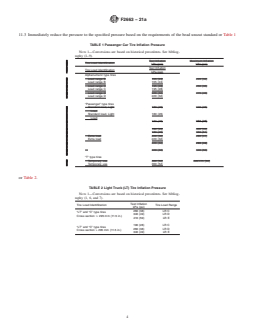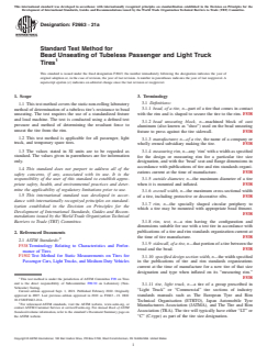 ASTM F2663-21a is a standard published by ASTM International. Its full title is "Standard Test Method for Bead Unseating of Tubeless Passenger and Light Truck Tires". This standard covers: SIGNIFICANCE AND USE 5.1 This test method establishes a standard procedure for the test and provides data that can be related to the force required to unseat the bead of a tire inflated with a specified pressure from the rim. This test method does not establish performance limits or tolerances for tire specifications. SCOPE 1.1 This test method covers the static non-rolling laboratory method of determination of a tubeless tire’s resistance to bead unseating. The test requires the use of a standardized fixture and load machine. The test is conducted using a defined test pressure and method of determining the resultant force to unseat the tire from the rim. 1.2 This test method is applicable for all passenger, light truck, and temporary spare tires. 1.3 The values stated in SI units are to be regarded as standard. The values given in parentheses are for information only. 1.4 This standard does not purport to address all of the safety concerns, if any, associated with its use. It is the responsibility of the user of this standard to establish appropriate safety, health, and environmental practices and determine the applicability of regulatory limitations prior to use. 1.5 This international standard was developed in accordance with internationally recognized principles on standardization established in the Decision on Principles for the Development of International Standards, Guides and Recommendations issued by the World Trade Organization Technical Barriers to Trade (TBT) Committee.