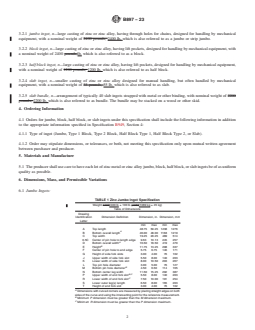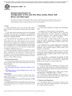 ASTM B897-23 is a technical specification published by ASTM International. Its full title is "Standard Specification for Configuration of Zinc and Zinc Alloy Jumbo, Block, Half Block, and Slab Ingot". This standard covers: ABSTRACT This specification covers zinc and zinc alloy jumbo and block ingots meeting dimensional requirements. Zinc jumbo and block ingot specifications shall include dimension definition and limits in dimension. Jumbo or block ingots, or both, shall be reasonably free from dross, cracks, adhering foreign matter, undue surface oxide, and any "flash" that would interfere with handling and use. SCOPE 1.1 This specification covers zinc and zinc alloy jumbo, block, half block, and slab ingot meeting dimensional requirements. 1.2 The values stated in inch-pound units are to be regarded as standard. The values given in parentheses are mathematical conversions to SI units that are provided for information only and are not considered standard. 1.3 This standard does not purport to address all of the safety concerns, if any, associated with its use. It is the responsibility of the user of this standard to become familiar with all hazards including those identified in the appropriate Safety Data Sheet (SDS) for this product/material as provided by the manufacturer, to establish appropriate safety, health, and environmental practices, and determine the applicability of regulatory limitations prior to use. 1.4 This international standard was developed in accordance with internationally recognized principles on standardization established in the Decision on Principles for the Development of International Standards, Guides and Recommendations issued by the World Trade Organization Technical Barriers to Trade (TBT) Committee.