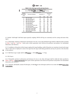 ABSTRACT This specification covers zinc and zinc alloy jumbo and block ingots meeting dimensional requirements. Zinc jumbo and block ingot specifications shall include dimension definition and limits in dimension. Jumbo or block ingots, or both, shall be reasonably free from dross, cracks, adhering foreign matter, undue surface oxide, and any "flash" that would interfere with handling and use. SCOPE 1.1 This specification covers zinc and zinc alloy jumbo, block, half block, and slab ingot meeting dimensional requirements. 1.2 The values stated in inch-pound units are to be regarded as standard. The values given in parentheses are mathematical conversions to SI units that are provided for information only and are not considered standard. 1.3 This standard does not purport to address all of the safety concerns, if any, associated with its use. It is the responsibility of the user of this standard to become familiar with all hazards including those identified in the appropriate Safety Data Sheet (SDS) for this product/material as provided by the manufacturer, to establish appropriate safety, health, and environmental practices, and determine the applicability of regulatory limitations prior to use. 1.4 This international standard was developed in accordance with internationally recognized principles on standardization established in the Decision on Principles for the Development of International Standards, Guides and Recommendations issued by the World Trade Organization Technical Barriers to Trade (TBT) Committee.