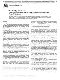 ASTM F3563-22 is a technical specification published by ASTM International. Its full title is "Standard Specification for Design and Construction of Large Fixed Wing Unmanned Aircraft Systems". This standard covers: SCOPE 1.1 Applicability: 1.1.1 This specification identifies the industry standards that have been determined by consensus to demonstrate compliance to the requirements (“the Rules”) for Unmanned Aircraft Systems (UAS). 1.1.2 This specification does not apply to UAS carrying passengers or crew. 1.1.3 The following are outside the scope of this Design and Construction Specification: Vertical Takeoff and Landing (VTOL) or Hybrid Aircraft, Passenger or Crew Carrying UAS, Seaplanes or Amphibians, UAS Certified for Acrobatic Flight, Lightweight UAS that fall under Specification F3298, Recreational UAS (Model Aircraft), Detect and Avoid Systems, Control Station Specifics to Human Factors, Building Codes that apply to Ground Control Stations, and Command and Control Link. 1.1.4 Only standards that are considered mature enough for general application to certification projects and have been found acceptable by committee consensus to propose to the civil aviation authorities (CAAs) for acceptance as a Means of Compliance (MoC) to their Rules are included. 1.1.5 In the event that a particular CAA’s requirements are not harmonized with the other CAA’s requirements, the standards will be written to include the non-harmonized requirements as well as the harmonized requirements with the applicability defined in the standard. 1.2 Civil Aviation Authorities—CAAs may accept a specific revision of this specification as an acceptable MoC to their requirements. Acceptance and applicability as an MoC to the CAA’s airworthiness rules remains the decision of the respective CAAs. CAAs may accept this specification, with or without limitations as defined in their specification acceptance document. For information on which CAAs have accepted these standards (in whole or in part) as an acceptable MoC to their Rules, refer to the ASTM Committee F44 (General Aviation), ASTM Committee F38 (Unmanned Aerial Systems) or ASTM Committee F39 (Aircraft Systems) webpages (www.astm.org/COMMITTEE/F44.htm, www.astm.org/COMMITTEE/F38.htm, www.astm.org/COMMITTEE/F39.htm), which include CAA website links. 1.3 Applicant Responsibility—The applicant must seek individual guidance from their respective CAA concerning the use of this specification and any referenced Specifications, Practices, Test Methods, or Guides to show compliance to the CAA rules. Alternatively, an applicant may propose an MoC other than those included in this specification, but it is their responsibility to obtain acceptance of their proposed MoC from their CAA. 1.4 This specification is based heavily on the ASTM Committee F44 General Aviation means of compliance guidelines. Unmanned Aircraft System specific guidance is provided below for areas where considerations specific to the unmanned application of aircraft differs from traditional manned aircraft specification or certification requirements. ASTM F3264–18b, Standard Specification for Normal Category Aeroplanes Certification, from the Committee F44 General Aviation group was used as the starting point with referenced ASTM F44 MoC Specification referenced throughout. The referenced F44 standard is to be used as is except in the areas where UAS-specific changes to standard MoC practices have been identified. These changes are identified in the following manner: 1.4.1 Unique Addition for UAS—New UAS-specific MoC added in addition to standard MoC in areas where new UAS functionality is introduced. 1.4.2 Substitutions for UAS—Modification of standard MoC to create similar UAS-specific MoCs. 1.4.3 Not Applicable for UAS—MoCs not needed for Unmanned Aircraft or Remote Pilot Station. 1.5 This standard does not purport to address all of the safety concerns, if any, associated with its use. It is the responsibility of the user of this standard to establish appropriate safety, health, and environmental practices and determine the applicability of regulatory limitations prior to use. 1.6 This international sta...