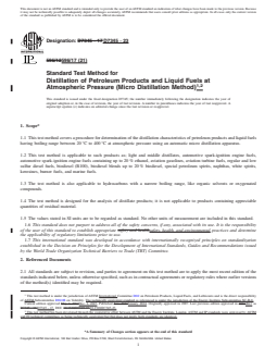 1.1 This test method covers a procedure for determination of the distillation characteristics of petroleum products and liquid fuels having boiling range between 20 °C to 400 °C at atmospheric pressure using an automatic micro distillation apparatus.