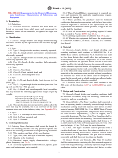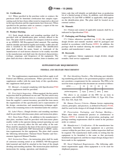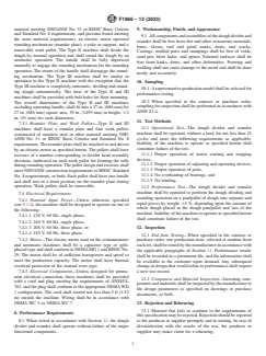ABSTRACT This specification covers commercial hand operated dough divider machines and semiautomatic and automatic, electrically operated, dough divider and rounding machines with or without interchangeable heads. Dough dividers and dough divider/rounding machines are classified by type, class, size, and styles: Types I, II, III, and IV; Classes I, II, and III; Sizes 1, 2, and 3; and Styles 1, 2, and 3. Operational test and performance test shall be performed to conform with the specified requirements. SCOPE 1.1 This specification covers commercial hand operated dough divider machines and semiautomatic and automatic, electrically operated, dough divider and rounding machines with or without interchangeable heads. 1.2 The values stated in inch-pound units are to be regarded as standard. The values given in parentheses are mathematical conversions to SI units that are provided for information only and are not considered standard. 1.3 This standard does not purport to address all of the safety concerns, if any, associated with its use. It is the responsibility of the user of this standard to establish appropriate safety, health, and environmental practices and determine the applicability of regulatory limitations prior to use. 1.4 This international standard was developed in accordance with internationally recognized principles on standardization established in the Decision on Principles for the Development of International Standards, Guides and Recommendations issued by the World Trade Organization Technical Barriers to Trade (TBT) Committee.