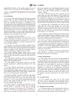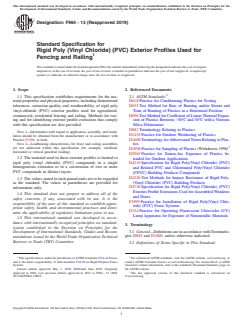 ABSTRACT This specification deals with rigid poly vinyl-chloride (PVC) exterior profiles used for agricultural, commercial, residential fencing and railing. The material used in these exterior profiles is limited to rigid poly (vinyl chloride) (PVC) compounds in a single homogeneous extrusion or in a coextrusion of two or more PVC compounds in distinct layers. Loadbearing characteristics for fence and railing assemblies are not addressed within this specification (for example, windload, horizontal or vertical guardrail loading). Materials shall be tested and shall conform to requirements for the material properties and physical properties, including dimensional tolerances, extrusion quality, and weatherability. Methods for testing and for identifying exterior profile extrusions, such as impact resistance, warp, dimensional stability, and impact test on weathered specimen that comply with this specification are also provided. SIGNIFICANCE AND USE 4.1 The purpose of this specification is to establish a recognized standard of quality for rigid poly vinyl chloride (PVC) exterior profiles for use in assembling agricultural, commercial, and residential fencing and railing. The term “PVC fence” refers to complete fencing and railings systems in which the primary structural members such as posts, rails, spindles, pickets, and gates are made from PVC exterior profiles. Accessory components (not included in this specification), including bolts, screws, hinges, latches, caps, and brackets, may be made from PVC or non-PVC materials, or both. The information contained in this specification is intended to be helpful to producers, distributors, and users and to promote understanding between purchasers and sellers. SCOPE 1.1 This specification establishes requirements for the material properties and physical properties, including dimensional tolerances, extrusion quality, and weatherability, of rigid poly vinyl-chloride (PVC) exterior profiles used for agricultural, commercial, residential fencing and railing. Methods for testing and for identifying exterior profile extrusions that comply with this specification are also provided. Note 1: Information with regard to application, assembly, and installation should be obtained from the manufacturer or in accordance with Practice F1999, or both. Note 2: Loadbearing characteristics for fence and railing assemblies are not addressed within this specification (for example, windload, horizontal or vertical guardrail loading). 1.2 The material used in these exterior profiles is limited to rigid poly (vinyl chloride) (PVC) compounds in a single homogeneous extrusion or in a coextrusion of two or more PVC compounds in distinct layers. 1.3 The values stated in inch-pound units are to be regarded as the standard. The values in parentheses are provided for information only. 1.4 This standard does not purport to address all of the safety concerns, if any, associated with its use. It is the responsibility of the user of this standard to establish appropriate safety, health, and environmental practices and determine the applicability of regulatory limitations prior to use. 1.5 This international standard was developed in accordance with internationally recognized principles on standardization established in the Decision on Principles for the Development of International Standards, Guides and Recommendations issued by the World Trade Organization Technical Barriers to Trade (TBT) Committee.