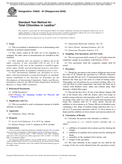 ASTM D4653-87(2020): Standard Test Method for Total Chlorides in Leather establishes a reliable procedure for determining the amount of soluble chlorides present in mineral tanned leather. Published by ASTM International, this standard supports quality control, regulatory compliance, and consistent product performance within the leather industry. The method is vital for leather producers, laboratories, and end users concerned with the chemical composition and durability of leather products.