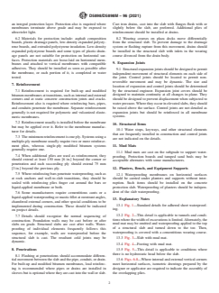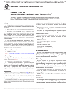 ASTM D5898/D5898M-96(2021) is a guide published by ASTM International. Its full title is "Standard Guide for Standard Details for Adhered Sheet Waterproofing". This standard covers: SIGNIFICANCE AND USE 4.1 This guide illustrates general details for below-grade and plaza waterproofing. It serves as a guide that will enable the designer to prepare complete waterproofing details for each specific condition that occurs on a project. SCOPE 1.1 This guide covers details for typical conditions encountered in adhered sheet waterproofing on below-grade structures and plazas. 1.2 This guide does not cover liquid-applied waterproofing. 1.3 The values stated in either SI units or inch-pound units are to be regarded separately as standard. The values stated in each system may not be exact equivalents; therefore, each system shall be used independently of the other. Combining values from the two systems may result in nonconformance with the standard. 1.4 This international standard was developed in accordance with internationally recognized principles on standardization established in the Decision on Principles for the Development of International Standards, Guides and Recommendations issued by the World Trade Organization Technical Barriers to Trade (TBT) Committee.