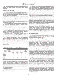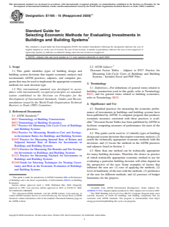 ASTM E1185-15(2020)e1 is a guide published by ASTM International. Its full title is "Standard Guide for Selecting Economic Methods for Evaluating Investments in Buildings and Building Systems". This standard covers: SIGNIFICANCE AND USE 4.1 Standard practices for measuring the economic performance of investments in buildings and building systems have been published by ASTM. A computer program that produces economic measures consistent with these practices is available.4 Discount Factor Tables has been published by ASTM to facilitate computing measures of performance for most of the practices. 4.2 This guide can be used to: (1) identify types of building design and system decisions that require economic analysis; (2) match the technically appropriate economic methods with the decisions; and (3) locate the methods in the ASTM practices and adjuncts listed in Section 2. 4.3 More than one method can be technically appropriate for many building decisions. Therefore the choice in practice of which technically appropriate economic method to use for evaluating a particular building decision will often depend on the perspective of the user. Some examples of factors that influence the user are: (1) ease of applying the methods, (2) level of familiarity of the user with the methods, (3) preference of the user for different methods, and (4) presence of budget limitations for the projects. 4.4 This guide identifies some features and limitations of the methods that might influence users' choices under varying conditions. SCOPE 1.1 This guide identifies types of building design and building system decisions that require economic analysis and recommends ASTM practices, adjuncts, and computer programs that may be used to implement the appropriate economic methods for each decision type. 1.2 This international standard was developed in accordance with internationally recognized principles on standardization established in the Decision on Principles for the Development of International Standards, Guides and Recommendations issued by the World Trade Organization Technical Barriers to Trade (TBT) Committee.