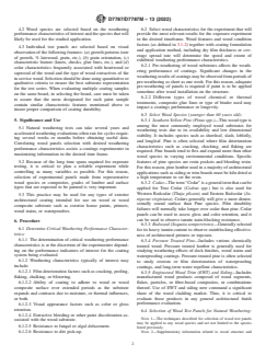 SIGNIFICANCE AND USE 5.1 Natural weathering tests can take several years and accelerated weathering evaluations often run for cycles requiring several weeks or months before obtaining useful data. Correlating wood panels selection with desired weathering performance characteristics assists a coatings experimenter in maximizing information in the desired time frame. 5.2 Because of the long time spans required for exposure testing, it is critical to plan a reliable experiment while controlling as many variables as possible. For this reason, selection of experimental panels made from representative wood species or composites, grades of lumber and surface types that are expected to be painted is very important. 5.3 This practice may be used for any types of exterior architectural coating intended for use on wood or wood composite substrate such as exterior house paints, primers, wood stains, or waterproofers. SCOPE 1.1 This practice offers guidelines for selecting wood or wood composite substrates for the evaluation of specific weathering performance characteristics of architectural coatings such as exterior paints, primers, and deck finishes. 1.2 Procedures include selecting wood species and choosing individual wood test panels through visual examination of the wood characteristics. 1.3 This practice is intended to cover the most commonly employed wood substrates used in weathering studies of architectural coatings. It is not intended to serve as a comprehensive guide for all wood species that may be employed for the purpose of evaluating weathering performance characteristics of architectural coatings. 1.4 The values stated in either SI units or inch-pound units are to be regarded separately as standard. The values stated in each system are not necessarily exact equivalents; therefore, to ensure conformance with the standard, each system shall be used independently of the other, and values from the two systems shall not be combined. 1.5 This standard does not purport to address all of the safety concerns, if any, associated with its use. It is the responsibility of the user of this standard to establish appropriate safety, health, and environmental practices and determine the applicability of regulatory limitations prior to use. 1.6 This international standard was developed in accordance with internationally recognized principles on standardization established in the Decision on Principles for the Development of International Standards, Guides and Recommendations issued by the World Trade Organization Technical Barriers to Trade (TBT) Committee.