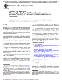 SIGNIFICANCE AND USE 5.1 This test method produces a measure of retroreflective efficiency (coefficient of retroreflected luminance, RL-2) for a pavement marking system under conditions of continuous wetting. The test result depends on factors such as the pavement marking binder and optic materials, their application, wear from traffic and plowing, wetting rate, and road grade and cross slope. 5.2 The measured retroreflective efficiency under conditions of continuous wetting may be used to characterize the properties of a pavement marking on the road as water is continuously falling on it. The retroreflective efficiency of the marking under conditions of continuous wetting is almost always different than under dry conditions. 5.3 The wetting rate of 2 in./h represents the upper limit of what is meteorologically classified as heavy rainfall. Rainfall rates above 2 in./h are classified as extreme or violent, and are sometimes associated with weather such as tropical storms. 5.4 The retroreflectivity of pavement markings degrades with traffic wear and requires periodic measurement to ensure that the coefficient of retroreflected luminance under continuous wetting meets requirements and provides adequate visibility for nighttime drivers. 5.5 The continuous wetting rate as well as the roadway grade and cross slope impact the results of this test method. The user shall measure and report the rate used for testing. 5.6 The roadway grade and cross slope adjacent to the measurement area impact the results of this test method. A digital level (inclinometer) can be used to quickly measure grade and cross slope. 5.7 Results obtained using this test method should not be the sole basis for specifying and assessing the wet retroreflective effectiveness of pavement marking systems. Users should complement the results of this test method with other evaluation results, such as nighttime visual inspections. SCOPE 1.1 This test method covers a measurement of the wet retroreflective (RL-2) properties of horizontal pavement marking materials, such as traffic stripes and road surface symbols. A standardized method utilizing a standardized continuous wetting device and a portable retroreflectometer is described to obtain measurements of the wet retroreflective properties of horizontal pavement markings. 1.2 Retroreflective performance obtained with this test in a standardized condition of continuous wetting does not necessarily relate to how markings perform in all conditions of natural rain. Note 1: Test Method E2177 may be used to describe the retroreflective properties of pavement markings in conditions of wetness, such as after a period of rain. 1.3 This test method is suitable for measurements made in the laboratory and in the field when the necessary controls and precautions are followed. 1.4 This test method specifies the use of external beam retroreflectometers conforming to Test Method E1710.2 The entrance and observation angles required of the retroreflectometer in this test method are commonly referred to as “30 meter geometry.”2 1.5 The test method excludes the effects of rain between the vehicle and the marking. 1.6 Results obtained using this test method should not be the sole basis for specifying and assessing the wet retroreflective effectiveness of pavement marking systems. Users should complement the results of this test method with other evaluation results, such as nighttime visual inspections. 1.7 The values stated in SI units are to be regarded as standard. The values given in parentheses are for information only. 1.8 This standard does not purport to address all of the safety concerns, if any, associated with its use. It is the responsibility of the user of this standard to establish appropriate safety, health, and environmental practices and determine the applicability of regulatory limitations prior to use. 1.9 This international standard was developed in accordance wi...