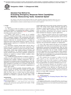 SIGNIFICANCE AND USE 5.1 A main purpose of using robots in emergency response operations is to enhance the safety and effectiveness of emergency responders operating in hazardous or inaccessible environments. The testing results of the candidate robot shall describe, in a statistically significant way, how reliably the robot is able to traverse the specified types of terrains and thus provide emergency responders sufficiently high levels of confidence to determine the applicability of the robot. 5.2 This test method addresses robot performance requirements expressed by emergency responders and representatives from other interested organizations. The performance data captured within this test method are indicative of the testing robot’s capabilities. Having available a roster of successfully tested robots with associated performance data to guide procurement and deployment decisions for emergency responders is consistent with the guideline of “Governments at all levels have a responsibility to develop detailed, robust, all-hazards response plans” as stated in National Response Framework. 5.3 The standard apparatus is specified to be easily fabricated to facilitate self-evaluation by robot developers and provide practice tasks for emergency responders to exercise robot actuators, sensors, and operator interfaces. The standard apparatus can also be used to support operator training and establish operator proficiency. 5.4 Although the test method was developed first for emergency response robots, it may be applicable to other operational domains. SCOPE 1.1 Purpose: 1.1.1 The purpose of this test method, as a part of a suite of mobility test methods, is to quantitatively evaluate a teleoperated ground robot’s (see Terminology E2521) sustained maneuvering speed on paved surfaces. 1.1.2 Robots shall possess a certain set of mobility capabilities, including maneuvering, to suit critical operations such as emergency responses. The environments often pose constraints to robotic mobility to various degrees. Being able to maneuver effectively for extended distances is essential for deployment down-range during emergency responses. This test method specifies apparatuses to standardize this maneuvering task for testing. 1.1.3 Emergency response ground robots shall be able to handle many types of obstacles and terrain complexities. The required mobility capabilities include traversing gaps, hurdles, stairs, slopes, various types of floor surfaces or terrains, and confined passageways. Yet additional mobility requirements include sustained speeds and towing capabilities. Standard test methods are required to evaluate whether candidate robots meet these requirements. 1.1.4 ASTM Task Group E54.08.01 on Robotics specifies a mobility test suite, which consists of a set of test methods for evaluating these mobility capability requirements. This sustained speed test method is a part of the mobility test suite. The apparatuses associated with the test methods challenge specific robot capabilities in repeatable ways to facilitate comparison of different robot models as well as particular configurations of similar robot models. 1.1.5 The test methods quantify elemental mobility capabilities necessary for ground robot intended for emergency response applications. As such, users of this standard can use either the entire suite or a subset based on their particular performance requirements. Users are also allowed to weight particular test methods or particular metrics within a test method differently based on their specific performance requirements. The testing results should collectively represent an emergency response ground robot’s overall mobility performance as required. These performance data can be used to guide procurement specifications and acceptance testing for robots intended for emergency response applications. Note 1: Additional test methods within the suite are anticipated to be developed to addres...