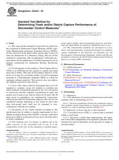 ASTM E3332-23 is a standard published by ASTM International. Its full title is "Standard Test Method for Determining Trash and/or Debris Capture Performance of Stormwater Control Measures". This standard covers: SIGNIFICANCE AND USE 5.1 This standard, used in conjunction with a verification protocol can be used to gain certification for the purposes of the removal of trash and/or debris from stormwater runoff in order to meet regulatory and permit needs. SCOPE 1.1 The scope of this standard is to provide test criteria for the evaluation of Stormwater Control Measures (SCM), especially Manufactured stormwater Treatment Devices (MTDs), for the removal of trash and/or debris greater than 5 mm in at least two dimensions in a laboratory setting. The use of this standard in conjunction with an appropriate verification program allows for the publication of verified reporting for use in gaining certification by Authorities Having Jurisdiction (AHJs). 1.2 For the purpose of this method, a Trash Capture Device (TCD) is an SCM that has the capacity to capture and retain trash and or debris. This may be the primary objective of the device or it may be a secondary feature of a device designed primarily as a Hydrodynamic Separator (HDS) or a filter for capturing sediment particles. This protocol does not address the sediment removal of such devices. 1.3 Units—The values stated in inch-pound units are to be regarded as standard, except for methods to establish and report sediment concentration and particle size. It is convention to exclusively describe sediment concentration in mg/L and particle size in mm or μm, both of which are SI units. The SI units given in parentheses are mathematical conversions, which are provided for information purposes only and are not considered standard. Reporting of test results in units other than inch-pound units shall not be regarded as non-conformance with this test method. 1.4 Acceptance of test results attained according to this specification may be subject to specific requirements set by a Quality Assurance Project Plan (QAPP), a specific verification protocol, or AHJ. It is advised to review one or all of the above to ensure compliance 1.5 This standard does not purport to address all of the safety concerns, if any, associated with its use. It is the responsibility of the user of this standard to establish appropriate safety, health, and environmental practices and determine the applicability of regulatory limitations prior to use. 1.6 This international standard was developed in accordance with internationally recognized principles on standardization established in the Decision on Principles for the Development of International Standards, Guides and Recommendations issued by the World Trade Organization Technical Barriers to Trade (TBT) Committee.