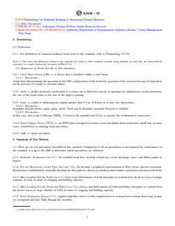 SIGNIFICANCE AND USE 5.1 This standard, used in conjunction with a verification protocol can be used to gain certification for the purposes of the removal of trash and/or debris from stormwater runoff in order to meet regulatory and permit needs. SCOPE 1.1 The scope of this standard is to provide test criteria for the evaluation of Stormwater Control Measures (SCM), especially Manufactured stormwater Treatment Devices (MTDs), for the removal of trash and/or debris greater than 5 mm in at least two dimensions in a laboratory setting. The use of this standard in conjunction with an appropriate verification program allows for the publication of verified reporting for use in gaining certification by Authorities Having Jurisdiction (AHJs). 1.2 For the purpose of this method, a Trash Capture Device (TCD) is an SCM that has the capacity to capture and retain trash and or debris. This may be the primary objective of the device or it may be a secondary feature of a device designed primarily as a Hydrodynamic Separator (HDS) or a filter for capturing sediment particles. This protocol does not address the sediment removal of such devices. 1.3 Units—The values stated in inch-pound units are to be regarded as standard, except for methods to establish and report sediment concentration and particle size. It is convention to exclusively describe sediment concentration in mg/L and particle size in mm or μm, both of which are SI units. The SI units given in parentheses are mathematical conversions, which are provided for information purposes only and are not considered standard. Reporting of test results in units other than inch-pound units shall not be regarded as non-conformance with this test method. 1.4 Acceptance of test results attained according to this specification may be subject to specific requirements set by a Quality Assurance Project Plan (QAPP), a specific verification protocol, or AHJ. It is advised to review one or all of the above to ensure compliance 1.5 This standard does not purport to address all of the safety concerns, if any, associated with its use. It is the responsibility of the user of this standard to establish appropriate safety, health, and environmental practices and determine the applicability of regulatory limitations prior to use. 1.6 This international standard was developed in accordance with internationally recognized principles on standardization established in the Decision on Principles for the Development of International Standards, Guides and Recommendations issued by the World Trade Organization Technical Barriers to Trade (TBT) Committee.