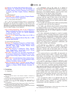 SIGNIFICANCE AND USE 5.1 This guide supports the development of material behavior models that can be used to estimate performance of the EBS materials during the post-closure period of a high-level nuclear waste repository for times much longer than can be tested directly. This guide is intended for modeling the degradation behaviors of materials proposed for use in an EBS designed to contain radionuclides over tens of thousands of years and more. There is both national and international recognition of the importance of the use and long-term performance of engineered materials in geologic repository design. Use of the models developed following the approaches described in this guide is intended to address established regulations, such as: 5.1.1 U.S. Public Law 97–425, the Nuclear Waste Policy Act of 1982, provides for the deep geologic disposal of high-level radioactive waste through a system of multiple barriers. These barriers include engineered barriers designed to prevent the migration of radionuclides out of the engineered system, and the geologic host medium that provides an additional transport barrier between the engineered system and biosphere. The regulations of the U.S. Nuclear Regulatory Commission for geologic disposal require a performance confirmation program to provide data through tests and analyses, where practicable, that demonstrate engineered systems and components that are designed or assumed to act as barriers after permanent closure are functioning as intended and anticipated. 5.1.2 IAEA Safety Requirements specify that engineered barriers shall be designed and the host environment shall be selected to provide containment of the radionuclides associated with the wastes. 5.1.3 The Swedish Regulatory Authority has provided general advice to the repository developer that the application of best available technique be followed in connection with disposal, which means that the siting, design, construction, and operation of the repository and appurtenant syste... SCOPE 1.1 This guide addresses how various test methods and data analyses can be used to develop models for the evaluation of the long-term alteration behavior of materials used in an engineered barrier system (EBS) for the disposal of spent nuclear fuel (SNF) and other high-level nuclear waste in a geologic repository. The alteration behavior of waste forms and EBS materials is important because it affects the retention of radionuclides within the disposal system either directly, as in the case of waste forms in which the radionuclides are initially immobilized, or indirectly, as in the case of EBS containment materials that restrict the ingress of groundwater or the egress of radionuclides that are released as the waste forms degrade. 1.2 The purpose of this guide is to provide a scientifically-based strategy for developing models that can be used to estimate material alteration behavior after a repository is permanently closed (that is, in the post-closure period). Because the timescale involved with geological disposal precludes direct validation of predictions, mechanistic understanding of the processes based on detailed data and models and consideration of the range of uncertainty are recommended. 1.3 This guide addresses the scientific bases and uncertainties in material behavior models and the impact on the confidence in the EBS design criteria and repository performance assessments using those models. This includes the identification and use of conservative assumptions to address uncertainty in the long-term performance of materials. 1.3.1 Steps involved in evaluating the performance of waste forms and EBS materials include problem definition, laboratory and field testing, modeling of individual and coupled processes, and model confirmation. 1.3.2 The estimates of waste form and EBS material performance are based on models derived from theoretical considerations, expert judgments, and interpretations of d...