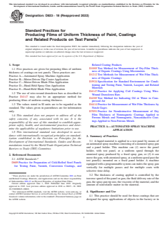 ASTM D823-18(2022) is a standard published by ASTM International. Its full title is "Standard Practices for Producing Films of Uniform Thickness of Paint, Coatings and Related Products on Test Panels". This standard covers: SIGNIFICANCE AND USE 4.1 This practice should be used for those coatings that are designed for spray applications of objects in the factory or in the field. It is particularly important that it be used in the evaluation of metallic coatings for appearance properties, such as gloss and color. 4.2 Coatings applied by this test method may exhibit a slight orange-peel or spray wave. SCOPE 1.1 Five practices are given for preparing films of uniform thickness of coatings on test panels. These practices are: Practice A—Automated Spray Machine Application Practice B—Motor-Driven Dip Coater Application Practice C—Motor-Driven Blade Film Application Practice D—Hand-Held Spray Gun Application Practice E—Hand-Held Blade Film Application 1.2 The use of wire-wound drawdown bars as described in Practice D4147 may also be an appropriate method for producing films of uniform coating thickness. 1.3 The values stated in SI units are to be regarded as the standard. The values given in parentheses are for information only. 1.4 This standard does not purport to address all of the safety concerns, if any, associated with its use. It is the responsibility of the user of this standard to establish appropriate safety, health, and environmental practices and determine the applicability of regulatory limitations prior to use. 1.5 This international standard was developed in accordance with internationally recognized principles on standardization established in the Decision on Principles for the Development of International Standards, Guides and Recommendations issued by the World Trade Organization Technical Barriers to Trade (TBT) Committee.
