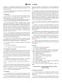 SIGNIFICANCE AND USE 4.1 This practice should be used for those coatings that are designed for spray applications of objects in the factory or in the field. It is particularly important that it be used in the evaluation of metallic coatings for appearance properties, such as gloss and color. 4.2 Coatings applied by this test method may exhibit a slight orange-peel or spray wave. SCOPE 1.1 Five practices are given for preparing films of uniform thickness of coatings on test panels. These practices are: Practice A—Automated Spray Machine Application Practice B—Motor-Driven Dip Coater Application Practice C—Motor-Driven Blade Film Application Practice D—Hand-Held Spray Gun Application Practice E—Hand-Held Blade Film Application 1.2 The use of wire-wound drawdown bars as described in Practice D4147 may also be an appropriate method for producing films of uniform coating thickness. 1.3 The values stated in SI units are to be regarded as the standard. The values given in parentheses are for information only. 1.4 This standard does not purport to address all of the safety concerns, if any, associated with its use. It is the responsibility of the user of this standard to establish appropriate safety, health, and environmental practices and determine the applicability of regulatory limitations prior to use. 1.5 This international standard was developed in accordance with internationally recognized principles on standardization established in the Decision on Principles for the Development of International Standards, Guides and Recommendations issued by the World Trade Organization Technical Barriers to Trade (TBT) Committee.