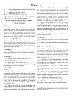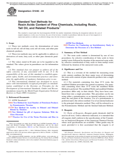 ASTM D1240-24 is a standard published by ASTM International. Its full title is "Standard Test Methods for Rosin Acids Content of Pine Chemicals, Including Rosin, Tall Oil, and Related Products". This standard covers: SIGNIFICANCE AND USE 4.1 This is a revision of the method for measuring rosin acids content combines the three major ways of determining the rosin acids content of pine chemicals products into a single method. 4.1.1 For materials containing less than 15 % rosin, the modified Glidden procedure has gained acceptance. For materials containing more than 15 % rosin the modified Wolfe Method is preferred. The modified Wolfe and modified Glidden procedures differ only in their details. They have been combined here into a single procedure. This procedure can be run using either a potentiometer or an internal indicator to determine the end point of the titration. Use of a potentiometer is preferred and is the referee method. Use of an internal indicator is the principal alternative method. They will be referred to as the Potentiometric Method and the Internal Indicator Method. SCOPE 1.1 These test methods cover the determination of rosin acids in tall oil, tall oil fatty acid, tall oil rosin, and other pine chemicals products. 1.2 These test methods may not be applicable to adducts or derivatives of rosin, fatty acid, or other pine chemicals products. 1.3 The values stated in SI units are to be regarded as the standard. The values given in parentheses are for information only. 1.4 This standard does not purport to address all of the safety concerns, if any, associated with its use. It is the responsibility of the user of this standard to establish appropriate safety, health, and environmental practices and determine the applicability of regulatory limitations prior to use. 1.5 This international standard was developed in accordance with internationally recognized principles on standardization established in the Decision on Principles for the Development of International Standards, Guides and Recommendations issued by the World Trade Organization Technical Barriers to Trade (TBT) Committee.
