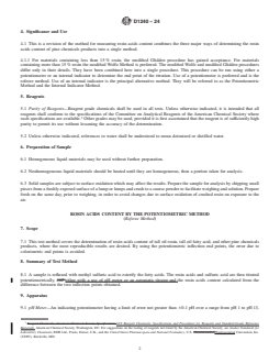 SIGNIFICANCE AND USE 4.1 This is a revision of the method for measuring rosin acids content combines the three major ways of determining the rosin acids content of pine chemicals products into a single method. 4.1.1 For materials containing less than 15 % rosin, the modified Glidden procedure has gained acceptance. For materials containing more than 15 % rosin the modified Wolfe Method is preferred. The modified Wolfe and modified Glidden procedures differ only in their details. They have been combined here into a single procedure. This procedure can be run using either a potentiometer or an internal indicator to determine the end point of the titration. Use of a potentiometer is preferred and is the referee method. Use of an internal indicator is the principal alternative method. They will be referred to as the Potentiometric Method and the Internal Indicator Method. SCOPE 1.1 These test methods cover the determination of rosin acids in tall oil, tall oil fatty acid, tall oil rosin, and other pine chemicals products. 1.2 These test methods may not be applicable to adducts or derivatives of rosin, fatty acid, or other pine chemicals products. 1.3 The values stated in SI units are to be regarded as the standard. The values given in parentheses are for information only. 1.4 This standard does not purport to address all of the safety concerns, if any, associated with its use. It is the responsibility of the user of this standard to establish appropriate safety, health, and environmental practices and determine the applicability of regulatory limitations prior to use. 1.5 This international standard was developed in accordance with internationally recognized principles on standardization established in the Decision on Principles for the Development of International Standards, Guides and Recommendations issued by the World Trade Organization Technical Barriers to Trade (TBT) Committee.