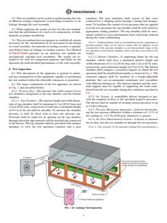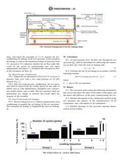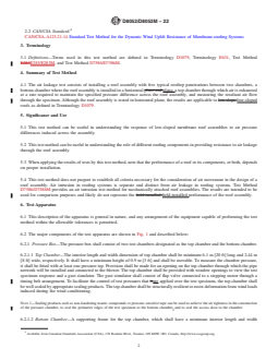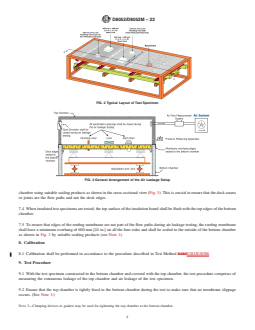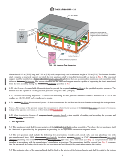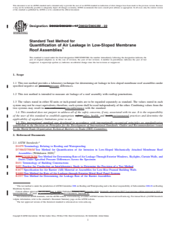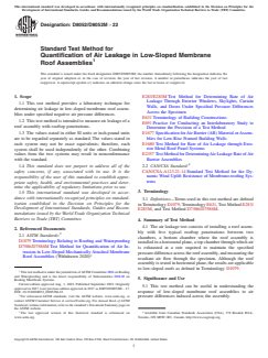 SIGNIFICANCE AND USE 5.1 This test method can be useful in understanding the response of low-sloped membrane roof assemblies to air pressure differences induced across the assembly. 5.2 This test method can be useful in understanding the role of different roofing components in providing resistance to air leakage through the roof assembly. 5.3 When applying the results of tests by this test method, note that the performance of a roof or its components, or both, depends on proper installation. 5.4 This test method does not purport to establish all criteria necessary for the consideration of air movement in the design of a roof assembly. Air intrusion in roofing systems is separate and distinct from air leakage in roofing systems. Test Method D7586/D7586M provides an air intrusion test method for mechanically attached roof assemblies. The results are intended to be used for comparison purposes and likely do not represent the field-installed performance of the roof assembly. SCOPE 1.1 This test method provides a laboratory technique for determining air leakage in low-sloped membrane roof assemblies under specified negative air pressure differences. 1.2 This test method is intended to measure air leakage of a roof assembly with rooftop penetrations. 1.3 The values stated in either SI units or inch-pound units are to be regarded separately as standard. The values stated in each system may not be exact equivalents; therefore, each system shall be used independently of the other. Combining values from the two systems may result in nonconformance with the standard. 1.4 This standard does not purport to address all of the safety concerns, if any, associated with its use. It is the responsibility of the user of this standard to establish appropriate safety, health, and environmental practices and determine the applicability of regulatory limitations prior to use. 1.5 This international standard was developed in accordance with internationally recognized principles on standardization established in the Decision on Principles for the Development of International Standards, Guides and Recommendations issued by the World Trade Organization Technical Barriers to Trade (TBT) Committee.