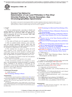 ASTM D7823-20 is a standard published by ASTM International. Its full title is "Standard Test Method for Determination of Low Level Phthalates in Poly (Vinyl Chloride) Plastics by Thermal Desorption—Gas Chromatography/Mass Spectrometry". This standard covers: SIGNIFICANCE AND USE 5.1 Identification and Quantitation of Phthalates—DBP, BBP, DEHP, DNOP, DINP, and DIDP are representative of the phthalates either banned or being monitored by a variety of regulations. Regulations include: EU—Directive 2005/84/EC, US—Consumer Product Safety Improvement Act of 2008 – section 108, Japan—Health, Labor and Welfare Ministry guideline No. 336 (2010) and IEC 62321-8:2017. These test methods provide a procedure to identify and quantify phthalates in PVC. 5.2 Other techniques successfully used to separate and identify phthalates in PVC include GC/MS, HPLC/UV, HPLC/MS, FTIR, and GC/FID (flame ionization detector). SCOPE 1.1 This test method provides a procedure to identify and quantify phthalates by thermal desorption (TD) gas chromatography (GC) mass spectrometry (MS). Six phthalates are used to demonstrate the use of the procedure: BBP, DBP, DEHP, DNOP, DINP and DIDP. 1.2 Within the context of this method, “low level” is defined as 1000 ppm. 1.3 The values in SI units are to be regarded as standard. 1.4 This test method includes references, notes and footnotes that provide explanatory material. These notes and footnotes (excluding those in the tables and figures) shall not be considered as requirements of this method. 1.5 This standard does not purport to address all of the safety concerns, if any, associated with its use. It is the responsibility of the user of this standard to establish appropriate safety, health, and environmental practices and determine the applicability of regulatory limitations prior to use. Note 1: The method can be extended to include other ortho-phthalates in a number of polymeric substrates. Note 2: There is no known ISO equivalent to this standard. 1.6 This international standard was developed in accordance with internationally recognized principles on standardization established in the Decision on Principles for the Development of International Standards, Guides and Recommendations issued by the World Trade Organization Technical Barriers to Trade (TBT) Committee.