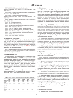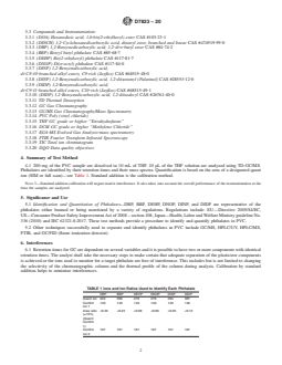 SIGNIFICANCE AND USE 5.1 Identification and Quantitation of Phthalates—DBP, BBP, DEHP, DNOP, DINP, and DIDP are representative of the phthalates either banned or being monitored by a variety of regulations. Regulations include: EU—Directive 2005/84/EC, US—Consumer Product Safety Improvement Act of 2008 – section 108, Japan—Health, Labor and Welfare Ministry guideline No. 336 (2010) and IEC 62321-8:2017. These test methods provide a procedure to identify and quantify phthalates in PVC. 5.2 Other techniques successfully used to separate and identify phthalates in PVC include GC/MS, HPLC/UV, HPLC/MS, FTIR, and GC/FID (flame ionization detector). SCOPE 1.1 This test method provides a procedure to identify and quantify phthalates by thermal desorption (TD) gas chromatography (GC) mass spectrometry (MS). Six phthalates are used to demonstrate the use of the procedure: BBP, DBP, DEHP, DNOP, DINP and DIDP. 1.2 Within the context of this method, “low level” is defined as 1000 ppm. 1.3 The values in SI units are to be regarded as standard. 1.4 This test method includes references, notes and footnotes that provide explanatory material. These notes and footnotes (excluding those in the tables and figures) shall not be considered as requirements of this method. 1.5 This standard does not purport to address all of the safety concerns, if any, associated with its use. It is the responsibility of the user of this standard to establish appropriate safety, health, and environmental practices and determine the applicability of regulatory limitations prior to use. Note 1: The method can be extended to include other ortho-phthalates in a number of polymeric substrates. Note 2: There is no known ISO equivalent to this standard. 1.6 This international standard was developed in accordance with internationally recognized principles on standardization established in the Decision on Principles for the Development of International Standards, Guides and Recommendations issued by the World Trade Organization Technical Barriers to Trade (TBT) Committee.