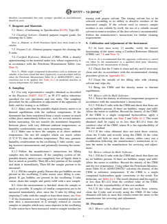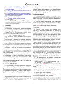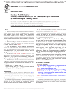 ASTM D7777-13(2018)e1 is a standard published by ASTM International. Its full title is "Standard Test Method for Density, Relative Density, or API Gravity of Liquid Petroleum by Portable Digital Density Meter". This standard covers: SIGNIFICANCE AND USE 5.1 The density, relative density, or API gravity of petroleum products are important quality indicators and are used in quantity calculations or to satisfy application, transportation, storage, and regulatory requirements. 5.2 This test method should not be used to determine density for custody transfer quantity calculations, particularly where mass or weight is the unit of quantity measurement. Test Method D4052 is appropriate for these applications. SCOPE 1.1 This test method covers the determination of the density, relative density, or API gravity of liquid petroleum products using portable digital density meters at test temperatures between 0 °C and 40 °C (32 °F to 104 °F). Its application is restricted to samples with a dry vapor pressure equivalent up to 80 kPa (11.6 psi) and a viscosity below 100 mm2/s (cSt) at the test temperature. 1.2 This test method is suitable for determining the density to the nearest 1 kg/m3. To determine the density to the nearest 0.1 kg/m3, use Test Method D4052. 1.3 This test method is easily calibrated and primarily suitable for field applications. It is important for the user to know and understand the electrical classification of the area in which the analyzer is to be used and to select an analyzer appropriate for that classification. 1.4 Test Methods D287, D1298, and D6822 are used in field applications. This test method provides an alternative field method that is easily calibrated and does not pose the hazard of hydrometer glass breakage present in current field methods. 1.5 Portable digital density meters measure the density and temperature of the filled-in sample at the sample temperature. The measured density and temperature are automatically converted into: Density at 15 °C / density at 60 °F Relative density 15 °C/15 °C / relative density 60 °F/60 °F API gravity 15 °C / API gravity 60 °F by the instrument using the calculation routines for Generalized Products as defined in Guide D1250. 1.6 If the density meter does not have in-built software to calculate the density at the reference temperature, this is calculated from the observed density at test temperature using the Petroleum Measurement Tables. 1.7 The accepted units of measure for density are kilograms per cubic metre (SI unit) or grams per cubic centimetre. Values in SI units are to be regarded as the standard. Values in parentheses are for information only. Both SI and customary units have been rounded; they may not be exactly equivalent. 1.8 This standard does not purport to address all of the safety concerns, if any, associated with its use. It is the responsibility of the user of this standard to establish appropriate safety, health, and environmental practices and determine the applicability of regulatory limitations prior to use. 1.9 This international standard was developed in accordance with internationally recognized principles on standardization established in the Decision on Principles for the Development of International Standards, Guides and Recommendations issued by the World Trade Organization Technical Barriers to Trade (TBT) Committee.