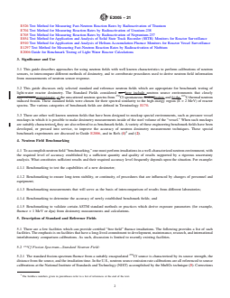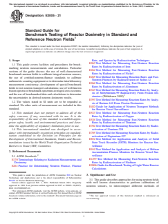 ASTM E2005-21 is a guide published by ASTM International. Its full title is "Standard Guide for Benchmark Testing of Reactor Dosimetry in Standard and Reference Neutron Fields". This standard covers: SIGNIFICANCE AND USE 3.1 This guide describes approaches for using neutron fields with well known characteristics to perform calibrations of neutron sensors, to intercompare different methods of dosimetry, and to corroborate procedures used to derive neutron field information from measurements of neutron sensor response. 3.2 This guide discusses only selected standard and reference neutron fields which are appropriate for benchmark testing of light-water reactor dosimetry. The Standard Fields considered here include neutron source environments that closely approximate: a) the unscattered neutron spectra from 252Cf spontaneous fission; and b) the 235U thermal neutron induced fission. These standard fields were chosen for their spectral similarity to the high energy region (E > 2 MeV) of reactor spectra. The various categories of benchmark fields are defined in Terminology E170. 3.3 There are other well known neutron fields that have been designed to mockup special environments, such as pressure vessel mockups in which it is possible to make dosimetry measurements inside of the steel volume of the “vessel.” When such mockups are suitably characterized, they are also referred to as benchmark fields. A variety of these engineering benchmark fields have been developed, or pressed into service, to improve the accuracy of neutron dosimetry measurement techniques. These special benchmark experiments are discussed in Guide E2006, and in Refs (1)4 and (2). SCOPE 1.1 This guide covers facilities and procedures for benchmarking neutron measurements and calculations. Particular sections of the guide discuss: the use of well-characterized benchmark neutron fields to calibrate integral neutron sensors; the use of certified-neutron-fluence standards to calibrate radiometric counting equipment or to determine interlaboratory measurement consistency; development of special benchmark fields to test neutron transport calculations; use of well-known fission spectra to benchmark spectrum-averaged cross sections; and the use of benchmarked data and calculations to determine the uncertainties in derived neutron dosimetry results. 1.2 The values stated in SI units are to be regarded as standard. No other units of measurement are included in this standard. 1.3 This standard does not purport to address all of the safety concerns, if any, associated with its use. It is the responsibility of the user of this standard to establish appropriate safety, health, and environmental practices and determine the applicability of regulatory limitations prior to use. 1.4 This international standard was developed in accordance with internationally recognized principles on standardization established in the Decision on Principles for the Development of International Standards, Guides and Recommendations issued by the World Trade Organization Technical Barriers to Trade (TBT) Committee.