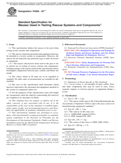 ASTM F2266-24e1 is a technical specification published by ASTM International. Its full title is "Standard Specification for Masses Used in Testing Rescue Systems and Components". This standard covers: ABSTRACT This specification defines the masses to be used when testing rescue systems and components. The masses represent personnel and equipment that may be attached to a rescue system or components. However, the masses do not represent any particular type or kind of rescuer or equipment. The masses shall be classified as follows: Type I; Type II; Type III; Type IV; and Type V. SCOPE 1.1 This specification defines the masses to be used when testing rescue systems and components. 1.2 The masses represent personnel and equipment that may be attached to a rescue system or components. However, the masses do not represent any particular type or kind of rescuer or equipment. 1.2.1 The masses chosen have been used in the past or are in current use in testing of rescue systems and components. Limiting testing to the masses listed in this specification allows meaningful comparisons between past, current, and future test results. 1.3 The values stated in SI units are to be regarded as standard. No other units of measurement are included in this standard. 1.4 The user of this specification shall determine which mass(es) represent(s) the personnel and equipment attached to the system or component under test. 1.5 For the purposes of this specification, mass and weight are synonymous when the object(s) representing the mass(es) are weighed in air anywhere on Earth. 1.6 This standard does not purport to address all of the safety concerns, if any, associated with its use. It is the responsibility of the user of this standard to establish appropriate safety, health, and environmental practices and determine the applicability of regulatory limitations prior to use. 1.7 This international standard was developed in accordance with internationally recognized principles on standardization established in the Decision on Principles for the Development of International Standards, Guides and Recommendations issued by the World Trade Organization Technical Barriers to Trade (TBT) Committee.