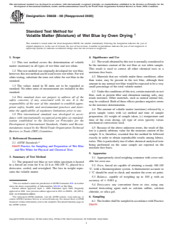 ASTM D6658-08(2020) is a standard published by ASTM International. Its full title is "Standard Test Method for Volatile Matter (Moisture) of Wet Blue by Oven Drying". This standard covers: SIGNIFICANCE AND USE 4.1 The result obtained by this test is normally considered to be the moisture content of the wet blue or wet white sample. This result is used to correct all other chemical tests to a moisture-free basis. 4.2 Materials that are volatile under these conditions, other than water, may be present in the wet blue, although their amount in any normal wet blue would be expected to be a very small percentage of the total volatile matter. 4.3 Under the conditions of this test, certain materials in wet blue, such as protein fiber and chromium tanning salts, may retain moisture. Other materials, such as natural animal fats, may be oxidized. Both of these effects produce negative errors in the moisture determination. 4.4 The amount of volatile matter (moisture) released by a given sample varies with (a) method and time of sample preparation, (b) weight of sample taken, (c) temperature and time of the oven drying, (d) type of oven (gravity versus mechanical convection) used. 4.5 Because of the above unknown errors, the result of this test is a purely arbitrary value for the moisture content of the sample. It is, therefore, essential that the method be followed exactly in order to obtain reproducible results among laboratories. This is particularly true if other chemical analytical tests being performed on the same sample are reported on the moisture-free basis. SCOPE 1.1 This test method covers the determination of volatile matter (moisture) in all types of wet blue and wet white. 1.2 This test method was originally developed for wet blue, however, this test method can be used to test wet white. For wet white testing, substitute the term wet white for wet blue in the standard. 1.3 The values stated in SI units are to be regarded as standard. No other units of measurement are included in this standard. 1.4 This standard does not purport to address all of the safety concerns, if any, associated with its use. It is the responsibility of the user of this standard to establish appropriate safety, health, and environmental practices and determine the applicability of regulatory limitations prior to use. 1.5 This international standard was developed in accordance with internationally recognized principles on standardization established in the Decision on Principles for the Development of International Standards, Guides and Recommendations issued by the World Trade Organization Technical Barriers to Trade (TBT) Committee.
