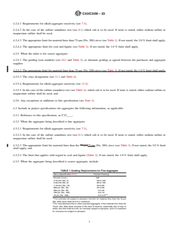 ABSTRACT This specification defines the requirements for grading and quality of fine and coarse aggregate for use in concrete. Fine aggregate shall consist of natural sand, manufactured sand, or a combination thereof. Fine aggregate shall be free of injurious amounts of organic impurities. Fine aggregate for use in concrete that will be subject to wetting, extended exposure to humid atmosphere, or contact with moist ground shall not contain any materials that are deleteriously reactive with the alkalis in the cement in amount sufficient to cause excessive expansion of mortar or concrete. Fine aggregate subjected to five cycles of the soundness test shall have a required weighted average loss. Coarse aggregate shall consist of gravel, crushed gravel, crushed stone, air-cooled blast furnace slag, or crushed hydraulic-cement concrete, or a combination thereof. The sampling and test methods shall be done with grading and fineness modulus test, organic impurities test, effect of organic impurities on strength test, soundness test, clay lumps and friable particles test, coal and lignite test, bulk density of slag test, abrasion of coarse aggregate test, reactive aggregate test, freezing and thawing test, and chert test method. SCOPE 1.1 This specification defines the requirements for grading and quality of fine and coarse aggregate (other than lightweight or heavyweight aggregate) for use in concrete.2 1.2 This specification is for use by a contractor, concrete supplier, or other purchaser as part of the purchase document describing the material to be furnished. Note 1: This specification is regarded as adequate to ensure satisfactory materials for most concrete. It is recognized that, for certain work or in certain regions, it may be either more or less restrictive than needed. For example, where aesthetics are important, more restrictive limits may be considered regarding impurities that would stain the concrete surface. The specifier should ascertain that aggregates specified are or can be made available in the area of the work, with regard to grading, physical, or chemical properties, or combination thereof. 1.3 This specification is also for use in project specifications to define the quality of aggregate, the nominal maximum size of the aggregate, and other specific grading requirements. Those responsible for selecting the proportions for the concrete mixture shall have the responsibility of determining the proportions of fine and coarse aggregate and the addition of blending aggregate sizes if required or approved. 1.4 The values stated in either SI units or inch-pound units are to be regarded separately as standard. The values stated in each system may not be exact equivalents; therefore, each system shall be used independently of the other. Combining values from the two systems may result in non-conformance with the standard. 1.5 The text of this standard refers to notes and footnotes that provide explanatory material. These notes and footnotes (excluding those in tables and figures) shall not be considered as requirements of this standard. 1.6 This international standard was developed in accordance with internationally recognized principles on standardization established in the Decision on Principles for the Development of International Standards, Guides and Recommendations issued by the World Trade Organization Technical Barriers to Trade (TBT) Committee.