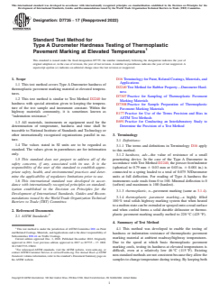 ASTM D7735-17(2022) is a standard published by ASTM International. Its full title is "Standard Test Method for Type A Durometer Hardness Testing of Thermoplastic Pavement Marking at Elevated Temperatures". This standard covers: SIGNIFICANCE AND USE 5.1 This method is based on the penetration of a specific type of indentor when forced into the material under specified conditions. The indentation hardness is inversely related to the penetration and is dependent on the elastic modulus, viscoelastic behavior of the material, geometry of the indentor, the applied force and temperature at test. This test method is empirical and therefore primarily for control purposes. No simple relationship exists between indentation hardness determined by this test method and any fundamental property of the material tested. SCOPE 1.1 This test method covers Type A Durometer hardness of thermoplastic pavement marking material at elevated temperatures. 1.2 This test method is similar to Test Method D2240 for hardness with special attention given to keeping the temperature of the test sample and instrument constant. Within the highway materials community, it is sometimes known as “indentation resistance.” 1.3 All materials, instruments or equipment used for the determination of temperature, hardness and time shall be traceable to National Institute of Standards and Technology or other internationally recognized organizations parallel in nature. 1.4 The values stated in SI units are to be regarded as standard. The values given in parentheses are for information only. 1.5 This standard does not purport to address all of the safety concerns, if any, associated with its use. It is the responsibility of the user of this standard to establish appropriate safety, health, and environmental practices and determine the applicability of regulatory limitations prior to use. 1.6 This international standard was developed in accordance with internationally recognized principles on standardization established in the Decision on Principles for the Development of International Standards, Guides and Recommendations issued by the World Trade Organization Technical Barriers to Trade (TBT) Committee.