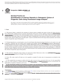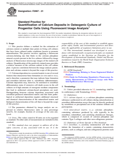ASTM F2997-21 is an international standard developed by ASTM International under Committee F04 on Medical and Surgical Materials and Devices. Titled "Standard Practice for Quantification of Calcium Deposits in Osteogenic Culture of Progenitor Cells Using Fluorescent Image Analysis," this practice outlines a reproducible method for estimating calcium content in living cell cultures, typically for bone tissue engineering and stem cell research. The standard specifically utilizes a non-toxic, calcium-chelating fluorescent dye (xylenol orange, XO) for staining, imaging, and visual quantification of mineralized calcium deposits during in-vitro osteoblast differentiation assays.