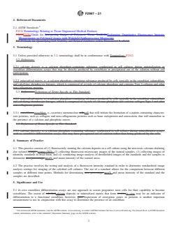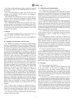 1.1 This practice defines a method for the estimation of calcium content at multiple time points in living cell cultures that have been cultured under conditions known to promote mineralization. The practice involves applying a fluorescent calcium-chelating dye that binds to the calcium phosphate mineral crystals present in the live cultures followed by image analysis of fluorescence microscopy images of the stained cell cultures. Quantification of the positively stained areas provides a relative measure of the calcium content in the cell culture plate. A precise correlation between the image analysis parameters and calcium content is beyond the scope of this practice.