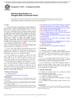 ASTM A1075-12(2022) is a technical specification published by ASTM International. Its full title is "Standard Specification for Flanged Steel U-Channel Posts". This standard covers: ABSTRACT This specification covers flanged U-channel carbon steel posts having a nominal weight ranging from 0.75 to 6.0 lb/ft and a nominal width ranging from 1.25 to 4.0 in. These posts are furnished in the as-wrought condition intended for applications requiring high tensile strength or crashworthiness and with a lower carbon (LC) designation for use where higher ductility or improved weldability are required. This specification indicates that tension tests and tensile tests are conducted on the flanged steel U-channel posts, and notes that retesting for failed mechanical properties may be permitted. SCOPE 1.1 This specification covers flanged U-channel carbon steel posts having a nominal weight ranging from 0.75 lb/ft to 6.0 lb/ft and a nominal width ranging from 1.25 in. to 4.0 in. These posts are furnished in the as-wrought condition intended for applications requiring high tensile strength or crashworthiness and with a lower carbon (LC) designation for use where higher ductility or improved weldability are required. These materials are available in multiple yield strength levels of 50 ksi, 60 ksi, 70 ksi, and 80 ksi (345 MPa, 420 MPa, 485 MPa, and 550 MPa). The 50 ksi and 60 ksi (345 MPa and 420 MPa) yield strength grades are available as lower carbon posts, designated as Grades 50LC or 60LC. Note 1: This specification does not cover high-strength low-alloy (HSLA) post. Refer to Specification A572/A572M for HSLA. For structural Grade 36, refer to Specification A36/A36M. 1.2 Units—The values stated in inch-pound units are to be regarded as the standard. The values given in parentheses are mathematical conversions to SI units that are provided for information only and are not considered standard. 1.3 This standard does not purport to address all of the safety concerns, if any, associated with its use. It is the responsibility of the user of this standard to establish appropriate safety, health, and environmental practices and determine the applicability of regulatory limitations prior to use. 1.4 This international standard was developed in accordance with internationally recognized principles on standardization established in the Decision on Principles for the Development of International Standards, Guides and Recommendations issued by the World Trade Organization Technical Barriers to Trade (TBT) Committee.