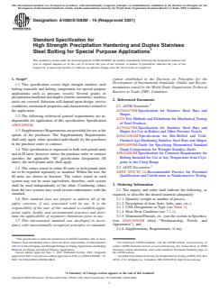 ASTM A1082/A1082M-16(2021) is an international standard specification developed by ASTM International for high strength stainless steel bolting materials and components, specifically focused on precipitation hardening and duplex (ferritic-austenitic) stainless steels for special purpose applications. The standard covers the requirements for bolting used in highly demanding environments such as pressure vessels, where strength, corrosion resistance, and reliability are critical. It outlines the criteria for mechanical properties, chemical composition, heat treatment, testing, certification, units of measure, and marking of these specialized fasteners.