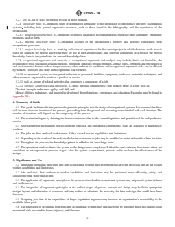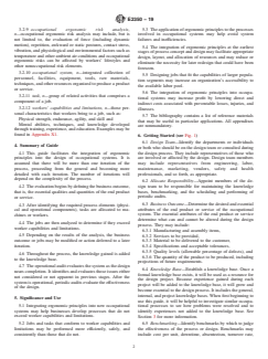 SIGNIFICANCE AND USE 5.1 Integrating ergonomic principles into new occupational systems may help businesses develop processes that do not exceed worker capabilities and limitations. 5.2 Jobs and tasks that conform to worker capabilities and limitations may be performed more efficiently, safely, and consistently than those that do not. 5.3 The application of ergonomic principles to the processes involved in occupational systems may help avoid system failures and inefficiencies. 5.4 The integration of ergonomic principles at the earliest stages of process concept and design may facilitate appropriate design, layout, and allocation of resources and may reduce or eliminate the necessity for later redesign that could have been foreseen. 5.5 Designing jobs that fit the capabilities of larger population segments may increase an organization's accessibility to the available labor pool. 5.6 The integration of ergonomic principles into occupational systems may increase profit by lowering direct and indirect costs associated with preventable losses, injuries, and illnesses. 5.7 The bibliography contains a list of reference materials that may be useful in particular applications. All appendixes are nonmandatory. SCOPE 1.1 This guide is intended to assist in the integration of ergonomic principles into the design and planning of new occupational systems from the earliest design stages through implementation. Doing so may reduce or eliminate the necessity for later redesign that could have been foreseen. 1.2 This standard does not purport to address all of the safety concerns, if any, associated with its use. It is the responsibility of the user of this standard to establish appropriate safety, health, and environmental practices and determine the applicability of regulatory limitations prior to use. 1.3 This international standard was developed in accordance with internationally recognized principles on standardization established in the Decision on Principles for the Development of International Standards, Guides and Recommendations issued by the World Trade Organization Technical Barriers to Trade (TBT) Committee.